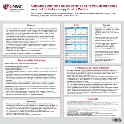 • Comparing Adenoma Detection Rate and Polyp Detection rates as a tool for Colonoscopy Quality Metrics by Quintin Ireland, Jenenne Geske, and Robert Messbarger